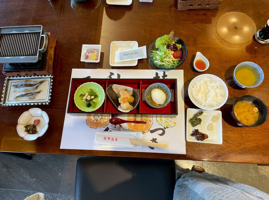朝食は和食の数品がすでに席に準備してあり、ご飯、味噌汁、漬物などがバイキング形式で食べることができました。